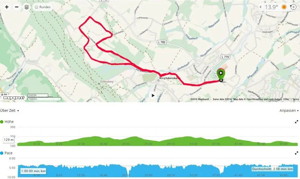 Das Tempo war für mich in 51:55 (3:56 min/km) absolut top ausgefallen. Wer die Runde kennt, der kennt auch die 235 HM.